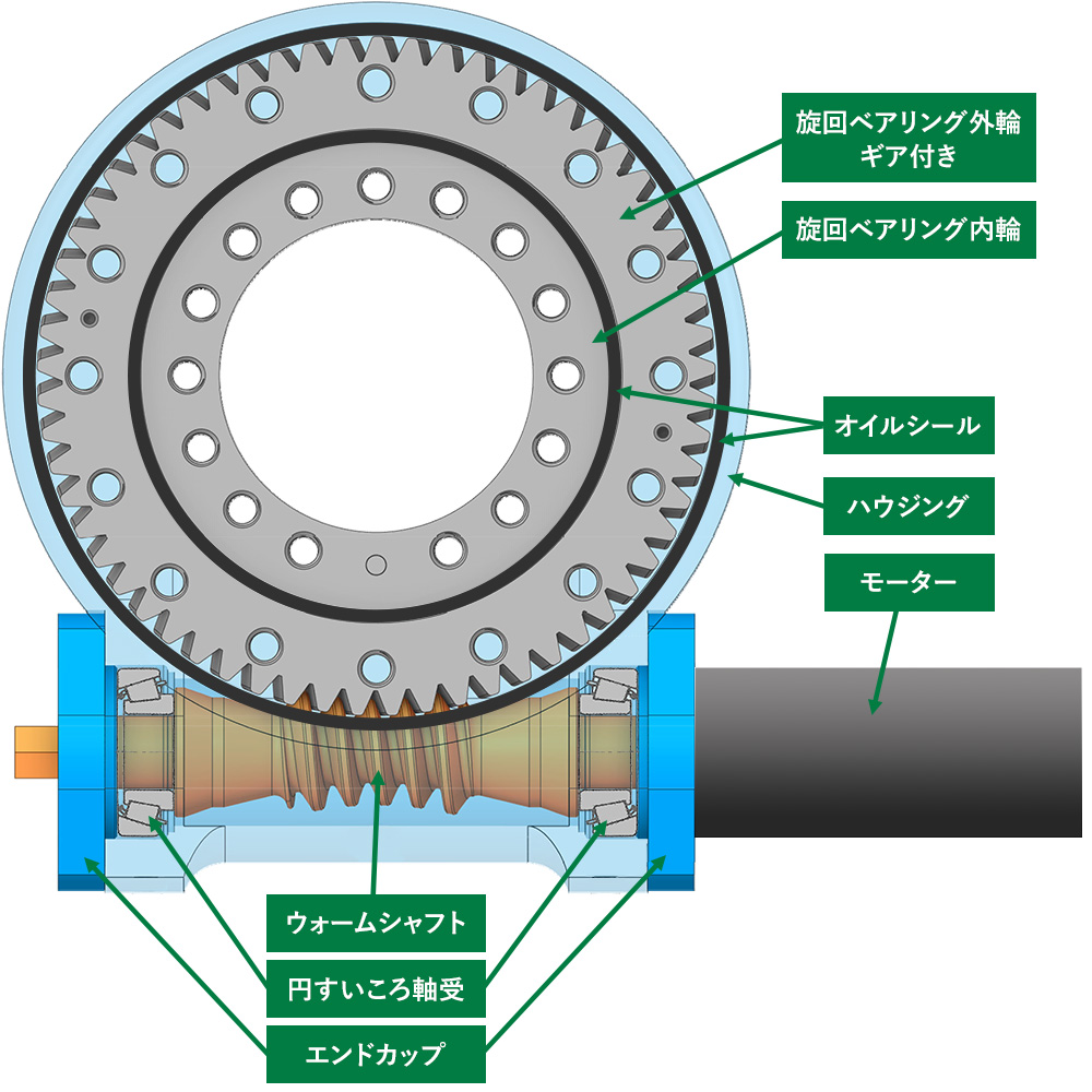 一般的に、単列ボールタイプのベアリング構造となっています。外輪には直接ギア(ウォームホイールまたはヘリカルギア)が加工されています。